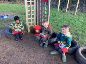 After this, we enjoyed a delicious Forest School treat by cooking bananas filled with chocolate chips over the fire. Even if they weren’t sure whether they would like it or not, every child showed resilience at tasting their treat (and there was actually hardly any waste!)