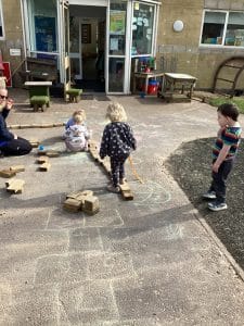 We looked at shadows in Forest school on Monday, using a sheet to make shapes with our bodies then using chalks to draw around shadows.