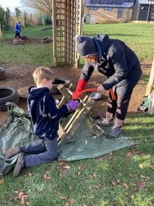 We braved the mud and the cold to enjoy another Forest School session. This time, we learnt about safely using a saw and drill. Miss Monks helped us to saw a piece of wood and then drill a small hole …