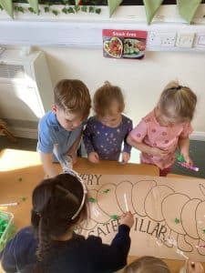 This week the children have been learning the story of The very hungry Caterpillar, they have been tasting watermelon, Swiss cheese, plums and salami at snack time like the caterpillar in the story. The children made a hungry Caterpillar by scrunching tissue paper and using glue to stick it to the caterpillar outline, please have a look at it on the wall at pick up they were very proud of it.