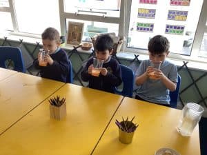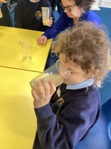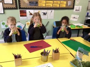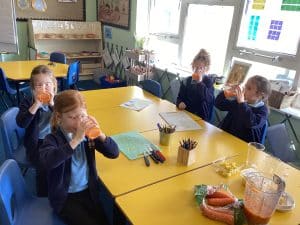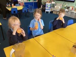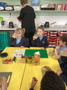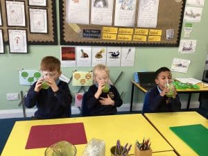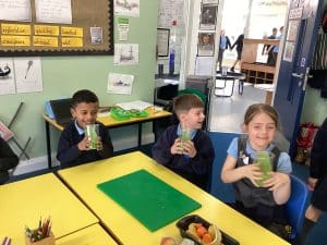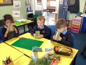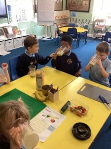 Year 1 have been learning about healthy eating in DT. From this they designed some healthy smoothies. All of the children had a go at cutting and preparing the fruit to put into the blender. The smoothies went down well with all the children!